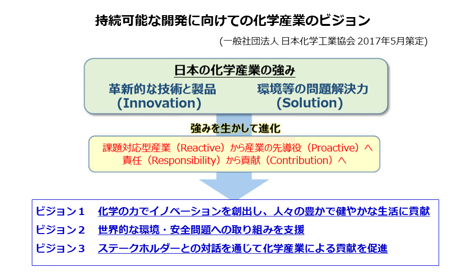 2017年初頭より、日本化学工業協会では、RC委員会の主要な会員会社数社をメンバーとしてタスクフォースを組み、日本の産業の歴史を振返りながら、化学産業が如何に SDGs に貢献出来るかを検討してまいりました。今般、各企業が日本の強みである革新的な技術と製品 (イノベーション) と問題解決力 (ソルーション) を生かして、更なる成長に向けた事業活動と持続可能な開発への貢献の両立を目指した3つのビジョンを、2017年5月に策定、公表しました。